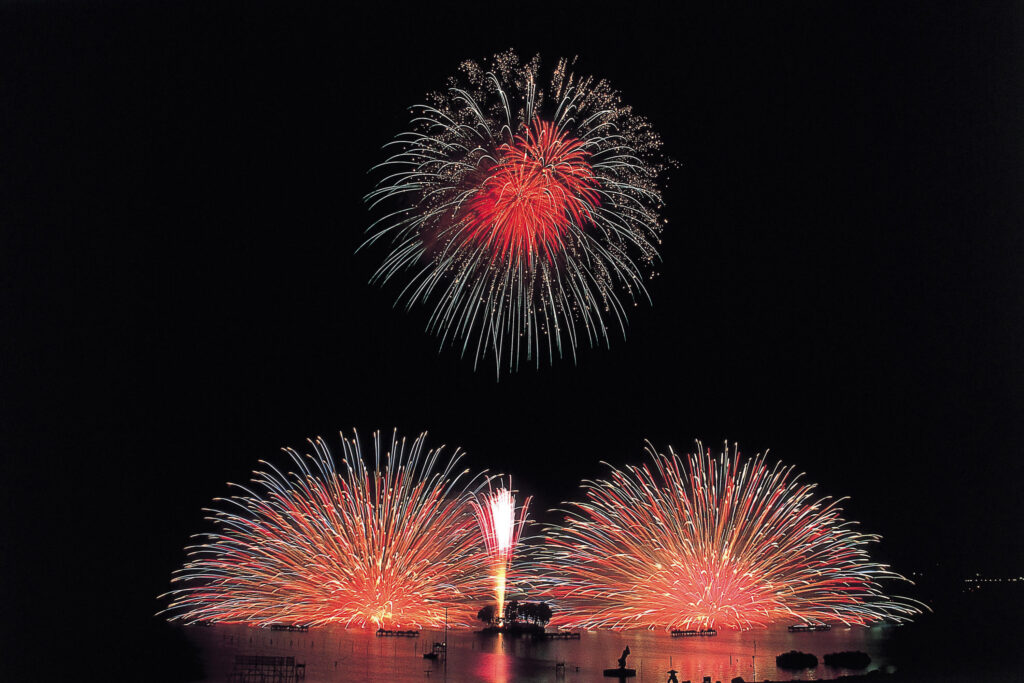 湖上ならではの水上スターマインなど、圧倒的なスケール感を誇る演出が魅力です。