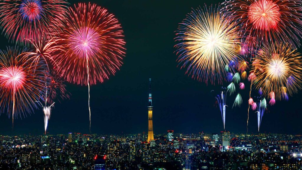 スカイツリーと隅田川花火が映った映像をご覧ください。