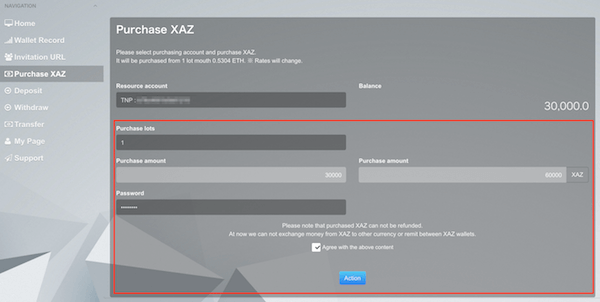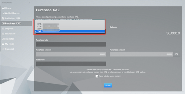 1:マイページから「Purchase XAZ」のタブをクリックして、「Resource account」と書かれてるところから「TNP」を選択