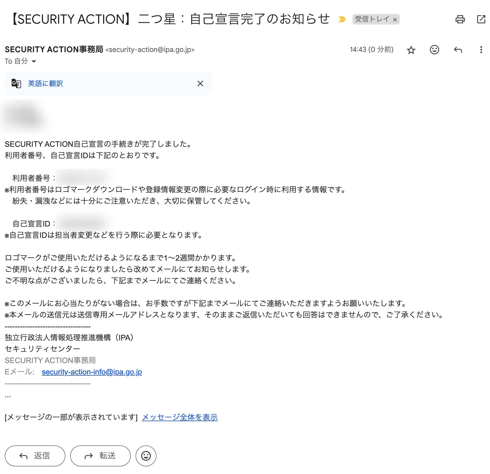 - 登録が完了すると、「自己宣言ID」がメールで配信されます。