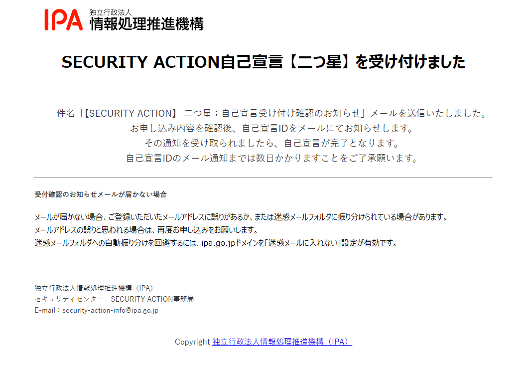 以上で「SECURITY ACTION自己宣言」完了です。